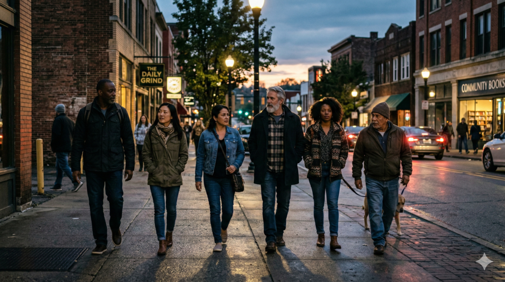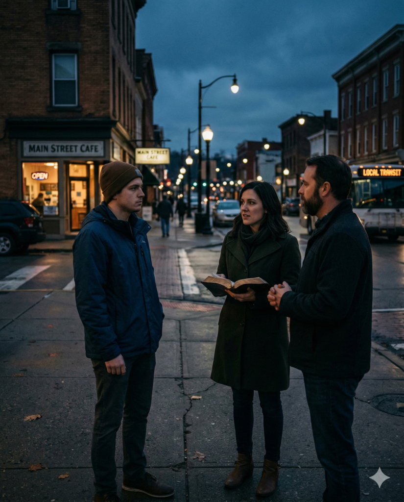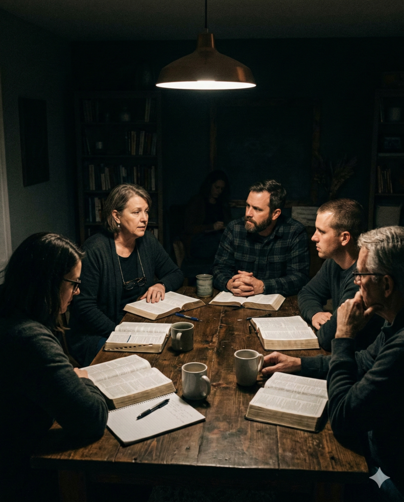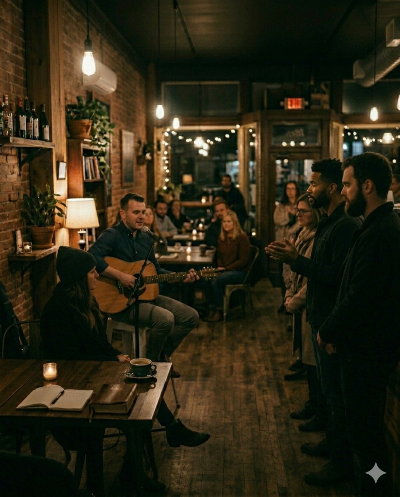 Scripture, conversation, and worship intersect in a grounded, intentional café gathering.